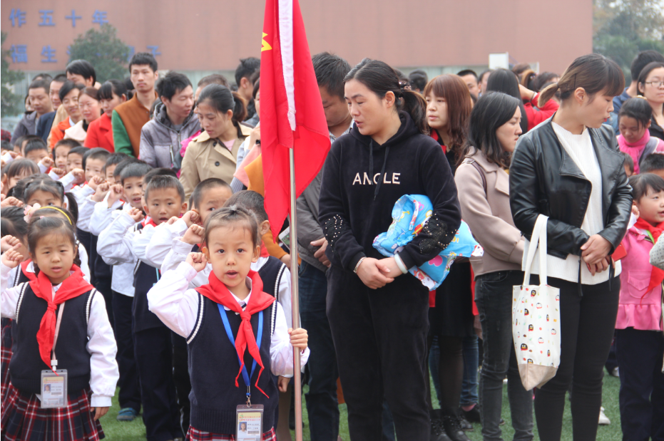 在仪式上,一年级家长给自己的孩子细心地系好了领巾。在“准备着,为共产主义事业而奋斗——时刻准备着。”的呼号声中,全体少先队员完成了一次特别而有意义的新生入队仪式。