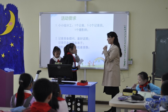 解丽主任先给全体综合实践活动教师展示了一节示范课。她基于学生的研究主题和研究的现状,选择了“学会采访”这个点进行教学。课堂上,解老师由简单的询问入课,引导学生观看视频,在比较、交流中学生明白了采访和询问的区别。接着学生小组合作设计采访的问题,在交流反馈中,学生明确了设计问题的关键点。有一个小组进行现场采访,其他组在观察思考中,在教师的引导下,掌握了采访过程中的注意事项。学生通过几个环节的体验、反思,在教师的引导提升中对采访的认识逐渐清晰。最后每个小组进行现场采访,从学生礼貌的问候,有主题的提问,合理的分工等表现中,我们可以看到孩子们在这节课上的拔节生长。解老师用多样的活动让学生在课堂上动了起来,用多角度的追问让学生思考起来,用有针对的指导让学生得到了满满的收获。这样的课堂学生怎能不喜欢呢?