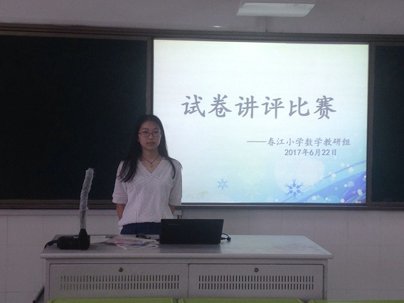 6月22日上午,春江中心小学数学组全体成员齐聚校本研修室,开展本学期较具挑战性的一次教研活动——试卷讲评比赛。参与本次比赛的选手都是临时抽签决定的。各年级组在周三进行了统一测试、阅卷,全组进行试卷分析。比赛要求各组通过抽签选出一名选手参加,就试卷上某一题型、某一知识领域的内容进行8-10分钟讲评。