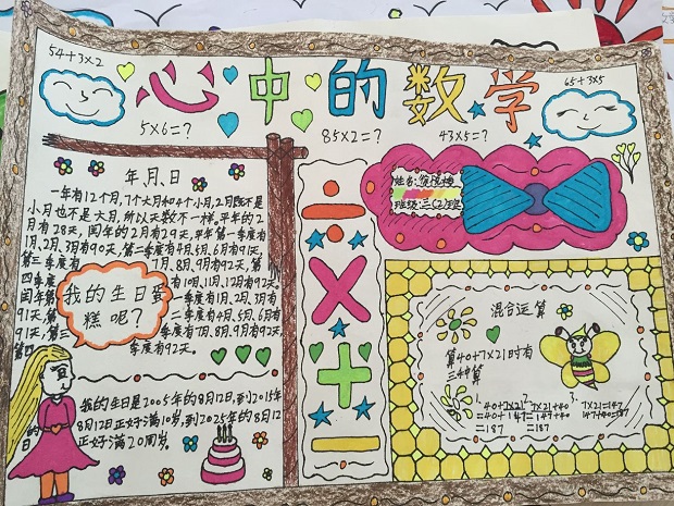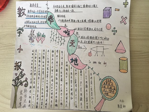 为了充分激发孩子们学习数学的热情,让孩子们尽情享受学习数学的乐趣。每个年级都展开了不同的趣味数学活动。一年级的“数学你我他”故事会。一年级小朋友虽然稚嫩,但他们还是精心的准备,描绘了一个个精彩的数学故事;二年级的“趣味钟面制作”。结合二年级新一单元的内容“时分秒”,通过学生自己动手制作时钟,帮助学生更好地理解“时分秒”;五年级的“魔方转转转”,学生们灵活的操作着手中的魔方,快速的进行复原,锻炼了学生的动手能力;六年级的“数学手抄报制作”,一个个伟大的数学家拉近了孩子们与数学的距离,一个个生动有趣的数学符号的故事,深深吸引着孩子们。还有三年级的“数学想象画”和四年级的“二十四点擂台赛”,都给孩子们带来了无限的快乐。数学节通过各类趣味活动将原本枯燥无味的数字变成了灵动的音符,更彰显了数学的无穷魅力。