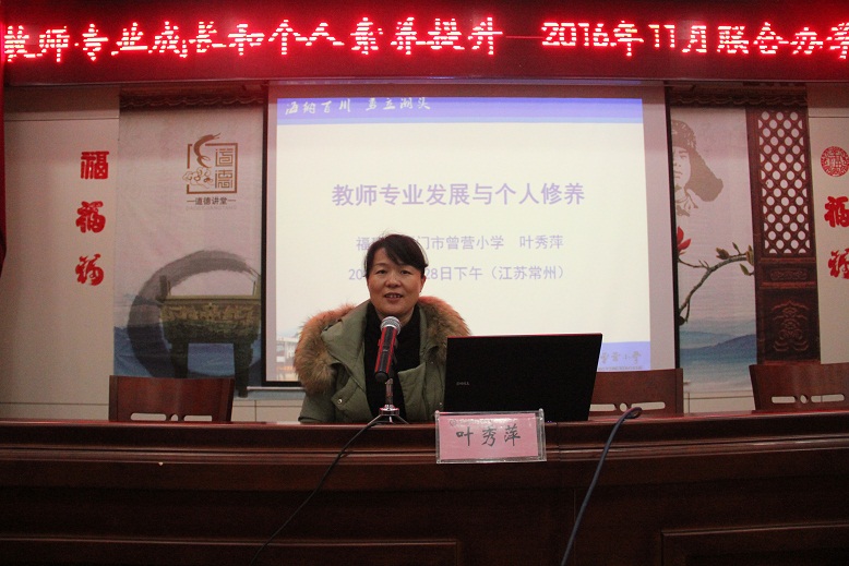 本次联合办学的第二项活动与每周一的“相约星期一”校本培训整合,由厦门曾营小学叶秀萍校长给大家带来了《教师专业发展和个人素养提升》的专题讲座。叶秀萍校长从愿景、阅读、磨课、科研、培训五大方面阐述了教师在专业发展和个人素养提升方面的明确的规划和有效的行动,她结合自己的专业成长的经历生动地再现了作为一名教育者孜孜不倦的追求。全体老师在感受叶校长的专业精神和教育境界同时也是对自身教育追求和教育行为的叩问和反思。