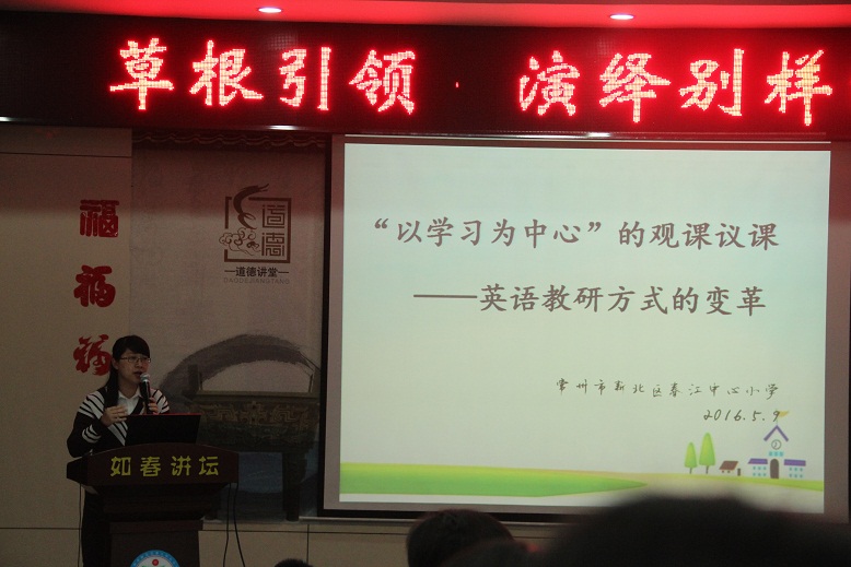 徐文娟老师介绍了《以学习为中心的观课议课——英语教研方式的变革》。她用生动而朴实的语言回顾了开学以来的四次研讨活动,展示了英语团队在研究过程中的酸甜苦辣,让大家共同见证了英语团队的研究意识和研究能力。