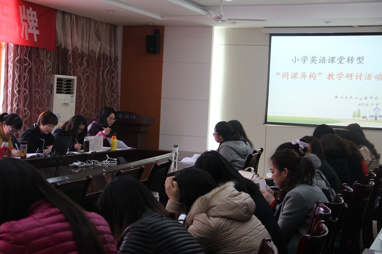 我区自2012年春天开展以小组学习来推动课堂转型的实践以来,老师们通过广泛地学习和课堂教学实践,不断探索有效的课堂教学模式模式,从而促进课堂转型,提升课程实施品质。2016年3月4日下午,在新北区教研室薛国民老师的组织下,小学英语课堂转型“同题异构”活动在在春江小学举行,区内其他学校的四年级英语老师参加了本次活动。
