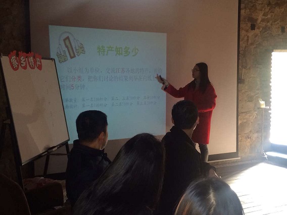 在简单的热身、破冰之后,由我校的陈慧老师带领大家一起体验了一节梦想课——《家乡特产》。陈老师采用了小组PK的形式,先以小组为单位在5分钟内列举江苏的特产,并进行分类。陈老师从列举的数量和分类设计方面进行了评价,给予小组相应的积分,调动了大家的积极性。在第二环节的家show环节,各位老师各显神通,展示的内容丰富,有介绍食品类的特产如常州的寸金糖、萝卜干;有介绍手工艺品的,如南通的盆景;还有介绍非物质类的,如常州的梳篦。展示的形式多元,有模仿《舌尖上的中国》的,有采用相声表演的形式,有的还把当地的童谣融入其中……欢声四起,乐在其中。在最后一个环节——特产大变身中,陈老师引导大家关注到了当前我们的一些特产面临的问题,引起了大家的深入思考……在最后的总结环节中,有的老师就合作谈了自己的想法,有的就我们的特产谈了自己的认识,有的针对这节课谈了它对自己教学的一些启发……