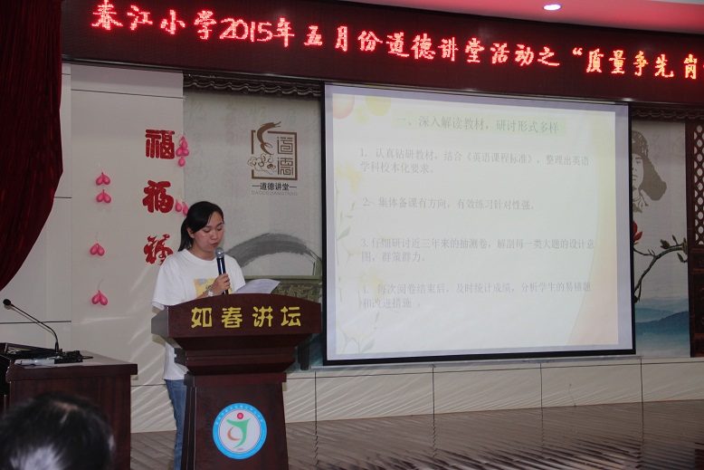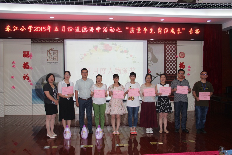 在“享受如春教育,培育有根新人”的理念下,为弘扬“质量争先 岗位成长”的师德风尚,传播我们春小教师的敬业故事,让先进师德理念能走心,外化于行,6月1日傍晚,春江中心小学全体教师齐聚一楼多功能厅,开展了五月份的道德讲堂暨五月月度人物颁奖活动。本次道德讲堂活动过程由徐文娟主任主持,分为唱歌曲,学模范,谈感悟,发证书,送吉祥等环节。