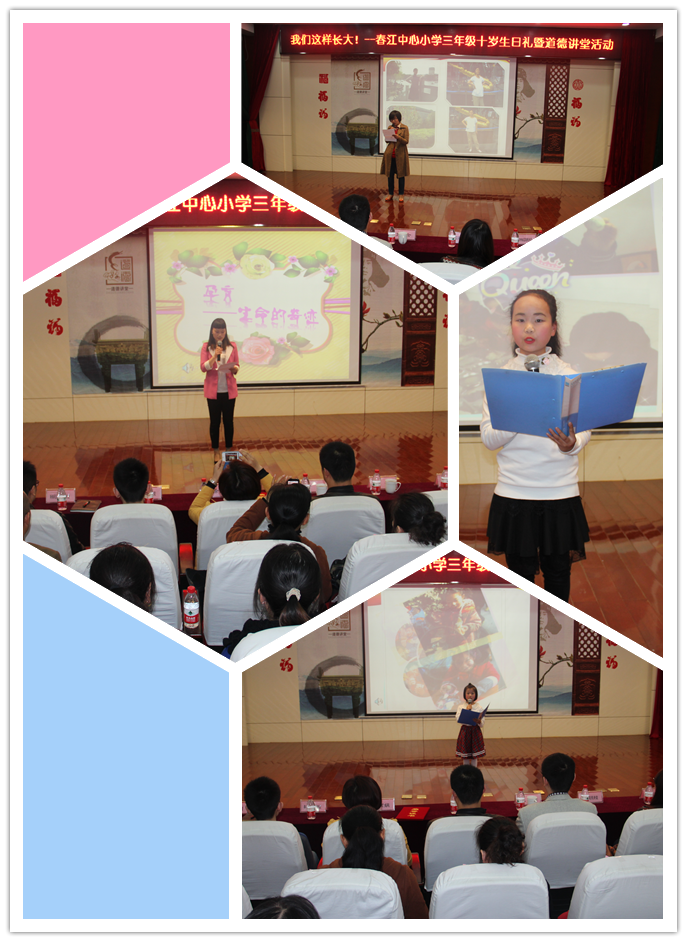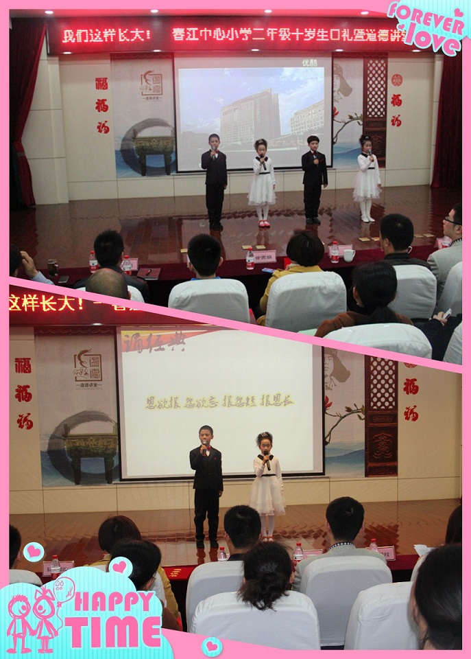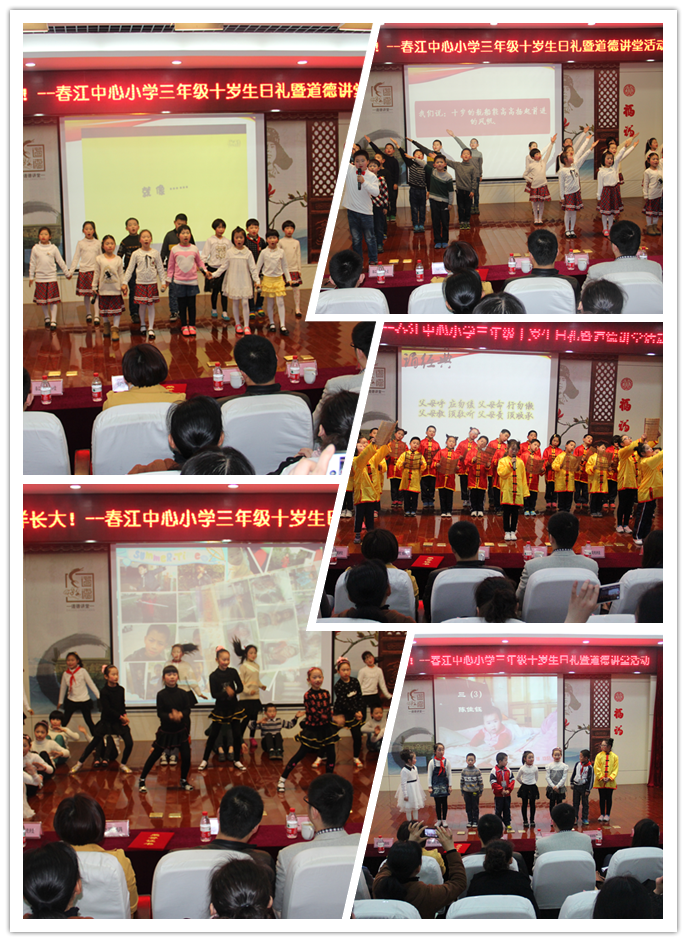 为进一步加强道德建设,弘扬典型事迹,充分发挥道德讲堂总堂的示范引领作用,达到“道德融入百姓生活,讲堂伴随人生成长”目标,春江镇道德讲堂活动走进了春江中心小学“我们这样长大”十岁生日礼的现场。4月3日下午,新北区文明办徐盛主任,春江镇文明办的领导及春江镇各中小学的道德讲堂负责人以及205位小寿星,孩子的家长和全校的班主任老师一起参与了此次活动。共同庆祝孩子们十岁的生日,分享着同一份快乐。