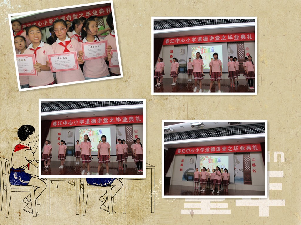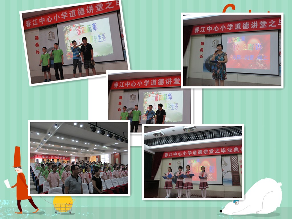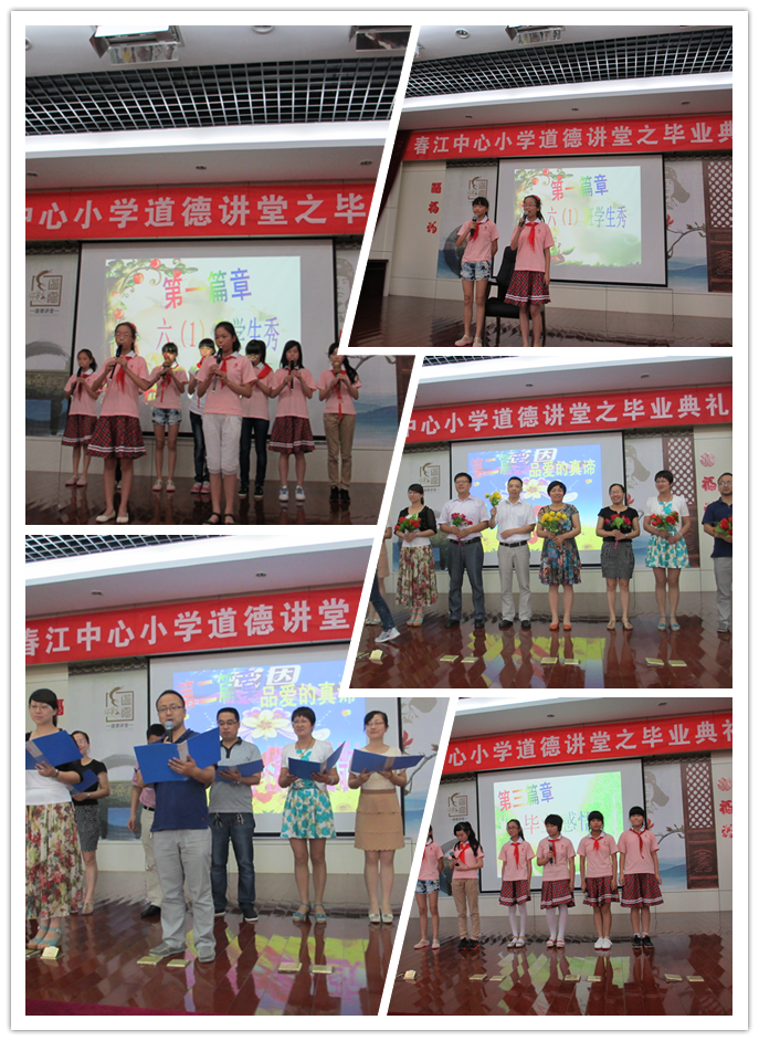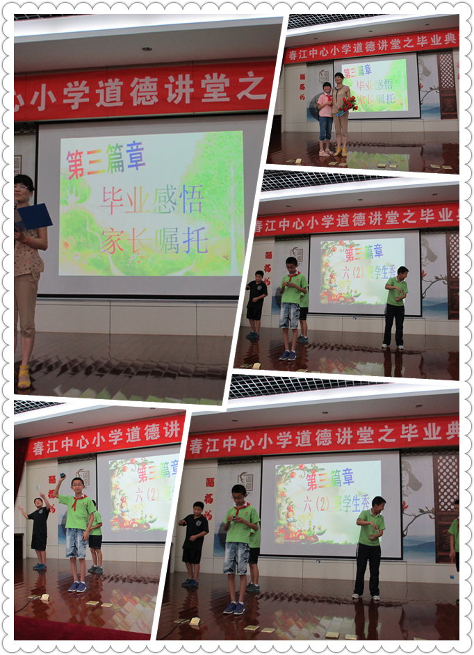 本次毕业班典礼分为五个篇章,分别是:忆成长的历程、品爱的真谛、谈内心的感受、发毕业证书、送诚挚的祝福。此次活动中通过视频的方式和孩子们一起回忆了他们的校园生活,成长的历程。接着同学们表演了精彩的节目,有葫芦丝演奏,二人双簧,小品《反义词》,超炫溜溜球,三句半《毕业三重奏》、歌曲《青春纪念册》,从而来表达他们对母校的深深眷恋,对老师们最真挚的感谢对小学生活的依依不舍之情。同学们伴着家长的嘱托和老师们的美好祝愿,在热烈的掌声中,校领导为学生们颁发毕业证书和优秀毕业生奖状,他们高举双手庆祝自己毕业。最后徐校长和大家一起回忆了与同学们所度过的点点滴滴,并提出了殷切的期望,希望春小的同学们做一个向善、向阳、向上的孩子,并教育大家要学会感恩家长,感恩老师,感恩母校,让全场师生倍受鼓舞!