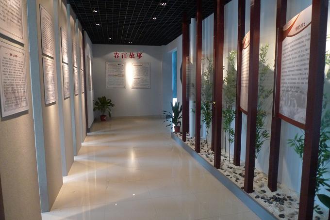 展厅:踏上青砖,可以感受到一股浓浓的江南小镇的韵味。正面墙上是巨幅的长江风貌图,很好地体现了整个春江的地域特点,真是“竹外桃花三两枝,春江水暖鸭先知”。看,大门上古色古香的青铜扣,高高挂起的大红灯笼,白墙黑瓦,庭院曲折,仿佛把我们带进了一个美好的江南水乡人家。