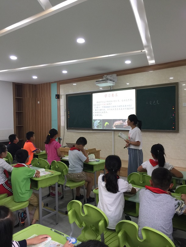 这次教研课一共推出两节研讨课,首先大家一起观摩了何倩老师执教的苏教版五上第六课《变色龙》。何老师在前期反复磨课的基础上继续认真钻研教材,解读学生,有所取舍,有所侧重地进行教学。在对学生读写能力的培养上她下了很大功夫。这节课的教学秩序井然,课堂师生互动惟妙惟肖,配合默契。孩子们不仅学到了有效的状物手法,更咀嚼到了文字的味道,可以说本堂课给我们在座的老师,尤其是年轻老师一个很好的示范。