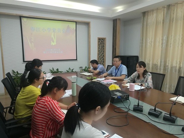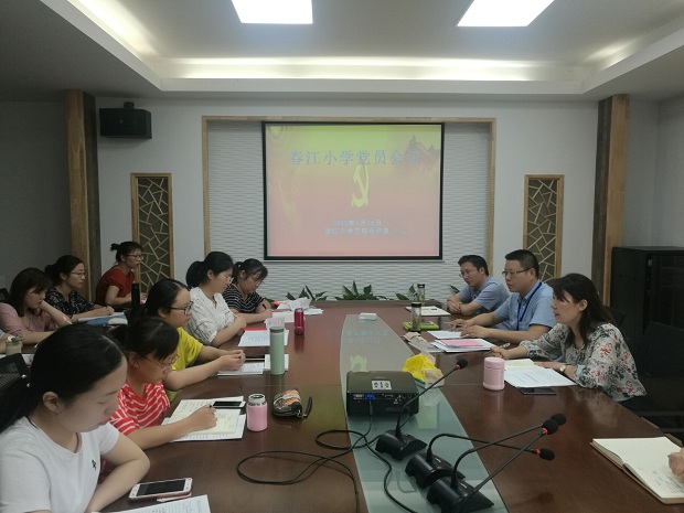 2018年9月20日星期四上午,秋风送爽,晴空万里,春江小学的党员同学们齐聚二楼会议室开始了本学期的第一次党员会议。今天的会议内容分为两个议程:发展学生发展中心的周海娣老师为中共预备党员,党支部书记万莺燕同志进行“立德树人,课程育人”的党课学习。将近一个小时的会议开展的丰富而有效。