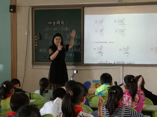 本次活动由四年级组承办,徐柏芳老师和王小艳老师分别执教除数是两位数的除法中的《四舍法试商》和《五入法试商》,选题很具单元结构教学的典型性。既是延续教学也是对比教学。