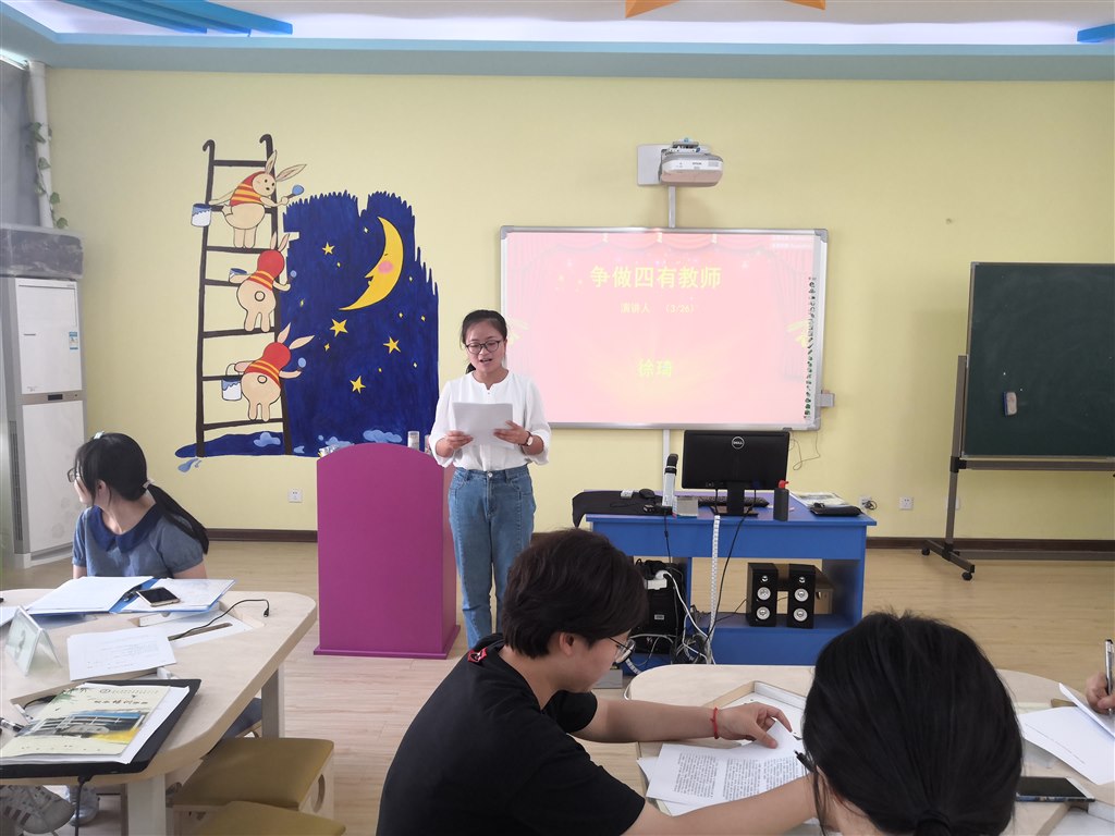活动开始,大家首先学习了习近平总书记重要的讲话精神,接着,大家用“抽签”的方式开始活动。徐琦、丁玲、吴玲和丁琪老师进行了演讲。丁琪老师从自己的教学经历讲起,她认为“四有”好老师是指:第一,做好老师,要有理想信念;第二,做好老师,要有道德情操;第三,做好老师,要有扎实学识;第四,做好老师,要有仁爱之心;徐琦老师和吴玲老师的发言则对她的发言进行了很好的补充,她说虽然教师的职业不是轻松的,而是一件长期繁琐的工作,但是教师承载着太多的民族使命,教师的工作对象更具有特殊性,所以这一切使教师的工作显得更有意义。最后发言的丁玲老师则显得更理性,拥有理想,坚定信念;传承道德,涵养情操;夯实基础,丰富学识;仁心向善,爱洒桃李是他理想中“四有”教师的形象。