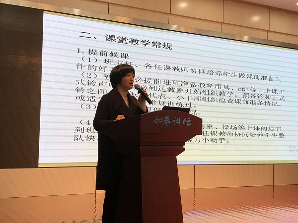 万校长从三组关键词谈了对教师工作的期待:一是专业和敬业,她从与幼儿园园长的谈话以及自身体验颈肩按摩的体验中,启发教师们如何在教学中体现我们的专业性,引导大家反思:我们在做的是有利于学生学科素养提升的事情吗?二是学习与生活,她指出教师在工作期间,办公室内学习、文化气息应该更浓厚一些。学生在校学习期间,教师要创造机会让学生从生活中学会学习。三是时间管理和效率,希望老师们利用好碎片化的时间学习,保持专注的学习状态,利用业余的时间提升自己。