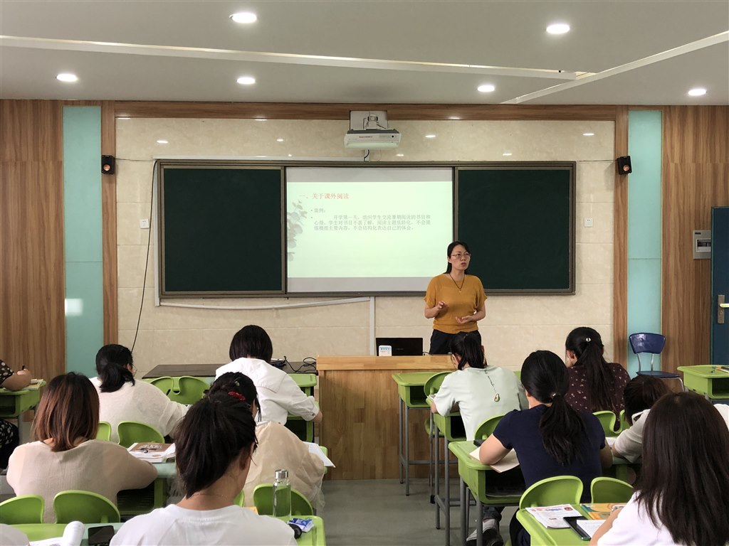 活动一开始,语文组的领头雁万莺燕校长为全体语文老师作了《阅读与表达:我们可以做些什么?》主题讲座。她首先罗列了学生对阅读书目不了解、阅读主题低龄化、不能概括主要内容的课外阅读现状,并提出教师应当成为阅读者和推广者的要求。同时,课外阅读主要需要主题拓展阅读和整本书的阅读同步推进,让课外阅读成为学生的常态。万校长还指出,我们还需要向课堂要效率,在语文课堂上渗透表达结构的教学,提升学生的思维能力和表达能力。结构化思维是指面对问题时可以通过某种结构拆解成一个个你能解决的部分。我们的课堂,老师还缺乏刨根问底的精神,在学生回答问题时,老师要关注学生全面思考问题和结构化表达的能力,真正提升学生的语文核心素养。