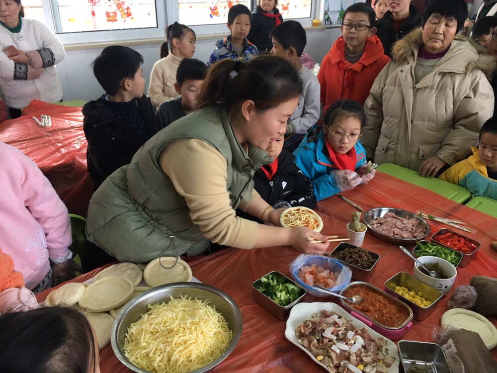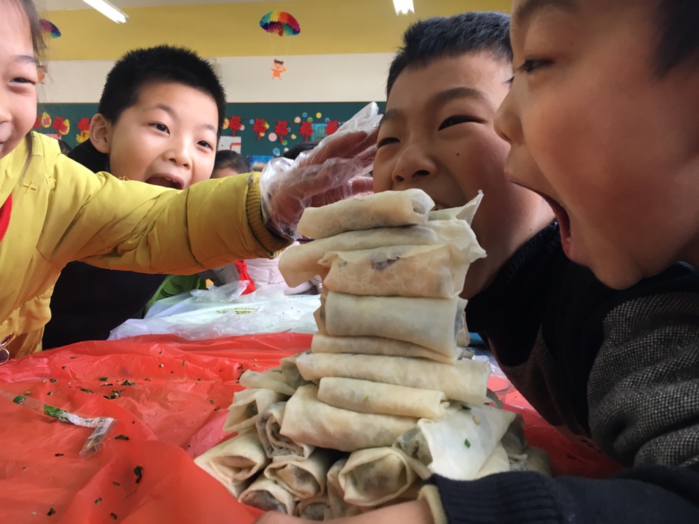 三(3)班“舌尖上的年味”中西结合,选择中国传统食物——春卷,西方传统食物——披萨,还有饭后甜点——蛋挞。孩子们亲自动手包春卷,卷起他们对新年的向往,对甜美未来的期待。在我们的披萨大厨“王思谭妈妈”的组织下,孩子们动手制作披萨,披萨上的层层芝士,与孩子们精心挑选的牛肉粒、花菜、彩椒、虾仁融合,一个个热腾腾的圆饼展现了孩子们对色彩斑斓生活的向往,孩子们惊叹于自己制作出的披萨拉丝,丝丝入扣,年味扣人心弦。