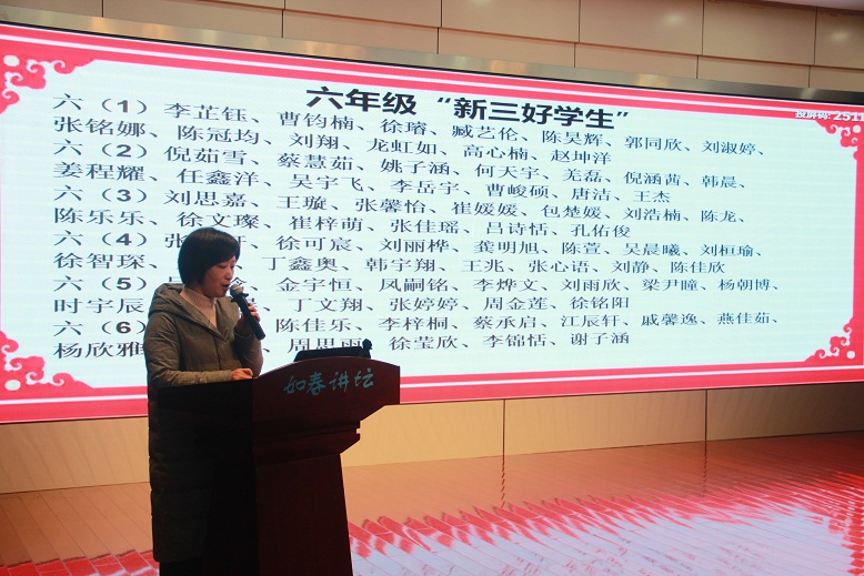 徐文娟副校长宣读了本学期“五好学生”名单,大屏幕上不断滚动播放这些“五好学生”的名字,各年级“五好学生”代表有序地上台领取奖状并与校领导合影。张建芬副校长宣读了本学期“新三好学生”的名单,全体师生一起为这些“五好学生”和“新三好学生”喝彩点赞,因为他们是最棒的。每一位上台领奖的春笋娃脸上洋溢着自信、幸福的笑容,享受着同学和老师们热烈掌声里的温馨祝福。