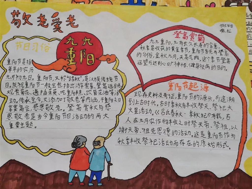 “独在异乡为异客,每逢佳节倍思亲”伴随着一点点的脚步声,一年一度的重阳节如期而至。新北区春江中心小学对本年度的重阳节活动十分重视,提前就发出了“我们的节日·重阳节”活动方案。四5“雏菊中队”的队员们积极参与本次活动,在辅导员徐慧老师的带领下,通过查资料、访谈、画小报的方式了解重阳佳节的来历和传说,通过主题班队课展示自己对重阳节的了解,充分认识和感受到了这一中华传统节日的魅力。