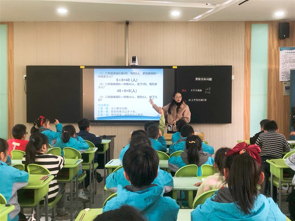 二年级左哲岚老师执教的是《乘除法解决实际问题练习》。左老师巧妙利用学生熟悉的卡通人数乔治闯关的游戏贯穿始终,激发学生的积极性。在课堂中通过多次“变式”对比练习,满足不同学生的学习需求,渗透解题策略的多样化。通过乘法与除法对比,乘法与加法对比,除法与减法的对比,突破学生对原有解决问题的认识,使学生的思维更开阔、更灵活、更有创造性。