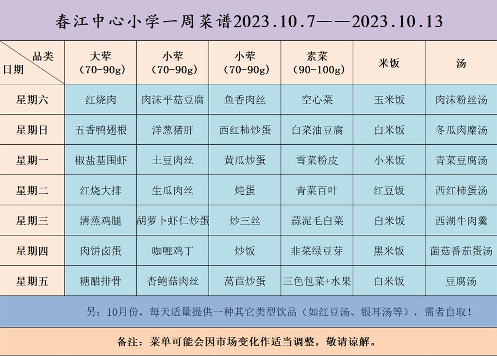 2023-2024学年度第一学期一周菜谱(第5、6周)