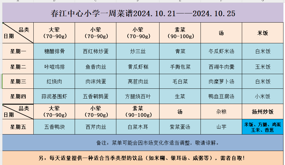 2024—2025学年第一学期一周菜谱(第八周)